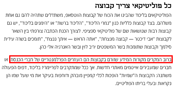 כל פוליטיקאי צריך קבוצה, ובליכוד לכל פוליטיקאי יש יותר מקבוצה אחת. גם כאן, לא מדובר בהתארגנות אותנטית, אלא קבוצות שמנוהלות על ידי עוזרים פרלמנטריים. אלה קבוצות שאחראיות בהרבה מאוד מקרים להפצת פייק ניוז וקונספירציות, אבל אף אחד לא ייקח על זה אחריות. למה? כי שוב, הקבוצות הללו הן מצג שווא של תמיכה עממית. הן "סתם קבוצות שמישהו פתח", בעוד שבפועל הן נפתחו על ידי אנשים שקשורים קשר ישיר לנבחרי הציבור, או פעילים פוליטיים, והן מפיצות תעמולה בשירות אותם אנשים. זו שיטה זולה מאוד והיא גם מאפשרת לאנשים האלה להתחבא. אם פוליטיקאי רוצה לפרסם באמצעות פרסום ממומן בפייסבוק, למשל, הוא יהיה חייב להזדהות ולהראות מי עומד מאחורי הפרסום. וחוץ מזה, אלה פרסומות – אף אחד לא רוצה אותן בפיד שלו.
